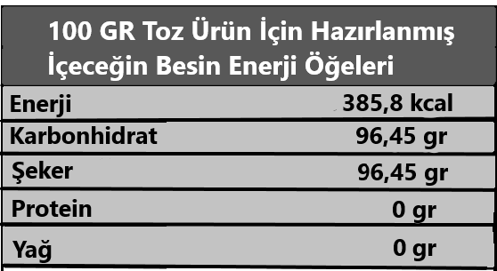 HAZIRLANIŞI: Sıcak içmek için 1 çay bardağı sıcak suya 2-3 çay kaşığı (10gr), soğuk içmek için 1 su bardağı soğuk suya 1 çorba kaşığı (25gr) Altıncezve Kuşburnu aromalı içecek tozu koyarak karıştırınız.